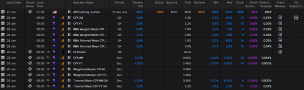 The week that WAS Well, what a week it has been. And that is putting it mildly. Thanks to US President Donald Trump’s 10% tariff threats against European allies over his Greenland ambitions – sparking the prospect of a fresh trade war – investors rushed for cover and triggered a familiar ‘Sell America’ trade last week. Stock benchmarks, Bonds, and the USD sold off in tandem – a trifecta of misery reminiscent of last year’s ‘Liberation Day’ tariff debacle. However, just as quickly as storm clouds gathered, they cleared. TACOs were back on the menu, with the President pulling back on the proposed European levies and stating that he will not take Greenland by force. Frankly, I did not expect such a rapid pullback on the tariff threats. Trump’s speech at the World Economic Forum in Davos, Switzerland, had something for everyone. This consisted of at least 30 minutes of him talking about how great he is to insulting French President Emmanuel Macron’s sunglasses, and ultimately the tariff pullback and his comments regarding his desire to acquire Greenland without the use of military force. Expectedly, this provided a relief rally for risk assets. The week that IS Fortunately, for those of us nursing their geopolitical-induced headaches, this week offers a chance to refocus on central bank decisions, inflation figures, and corporate earnings. Coordinated effort between the US and Japan? Before I get to that, intervention vibes out of the BoJ are making the airwaves. Despite Friday’s USD/JPY selloff – down 1.7% – this was not an intervention as it was just too small. There have been talks of ‘Fed rate checks’. To be clear, this does not involve buying or selling – it is essentially the Fed contacting dealers to obtain prices they would quote for large orders. To sum it up, it was this news that sent the USD south, as investors digest a more coordinated approach between the US and Japan, which could lead to larger moves lower. Therefore, keep a close eye on this market! Fed to hit the pause button, but for how long? Back to the week ahead, Wednesday will be the highlight of the week for the macro space, delivering updates from the Fed and the BoC – both of which are forecast to remain on hold – and the widely anticipated Australian Q4 25 CPI inflation print. The Fed is widely expected to remain on hold at 3.50% – 3.75%, following three consecutive rate cuts at the tail end of last year. A hold decision should raise few eyebrows, as the data between the last meeting and this week does not warrant a move. What investors will be watching closely, however, is the Fed’s communication: any suggestion about the pace of easing and, essentially, what is next. The press conference could be interesting to watch, particularly following the recent release of Fed Chair Jerome Powell’s video. The revelation that he faces legal threats from the Trump administration, which Powell called a ‘pretext’ for rate cuts, has nudged Fed independence back into the limelight. With Powell’s term as chair ending in May and Trump mulling nominees, the political backdrop has never been murkier. So, if Powell starts to push back against the Fed, it could open the door to further downside in the USD. However, if he supports easing, this could provide some relief for the buck. Heading into the event, markets are pricing in little-to-no chance of a reduction this week or at March’s meeting. Ultimately, markets are looking to either June or July for a 25-bp rate reduction. For me, the economy is not in bad shape, and we have not seen anything to suggest a move. Growth remains robust, inflation is above target – price pressures are still north of the Fed’s 2.0% inflation target as we saw with the latest inflation prints – and unemployment ticked lower. I believe the Fed needs two things to happen before they resume easing: continued disinflation and further deterioration in the labour market. BoC unlikely to move the market’s needle As I noted, the BoC will claim some of the spotlight on Wednesday; however, analysts expect the central bank to hold steady at 2.25%. This follows a cumulative 100 bps of cuts in 2025, from 3.25% to 2.25%. Markets are not expecting anything from the central bank this year, but there is a slight tilt towards a possible hike at the tail end of the year (+10 bps implied). Looking at the numbers ahead of the event, you can see inflation is heading in the right direction, with core measures recently decelerating, the labour market remains resilient, with growth looking ok. However, the Business Outlook Survey paints a gloomier picture, with firms exposed to trade increasingly pessimistic ahead of USMCA renegotiations, which could open the door for more uncertainty between the US and Canada. Unless there are talks of further tightening this year at this week’s meeting, which could be positive for the CAD, I do not see an edge here. So, assuming I am right, this meeting may be a case of kicking the can down the road. Aussie inflation is one to watch I will also be closely monitoring the Aussie CPI inflation figures this week on Wednesday, which is released prior to the Fed and BoC updates. In addition to the monthly data, we will also get the quarterly prints for Q4, as noted above, which are important for the RBA, therefore this report may be particularly market moving. As shown in the LSEG economic calendar below, analysts are largely expecting Q4 numbers to come in higher than the previous quarter Solid inflation data this week would likely be enough for the markets to fully price in three hikes this year – as of writing, markets are pricing in about 70 bps of hikes. Whether the markets have got a little bit ahead of themselves here is too early to tell, because while inflation has increased, growth is looking relatively resilient, and unemployment is lower. Regarding this week’s data, assuming a better-than-expected print – particularly the 