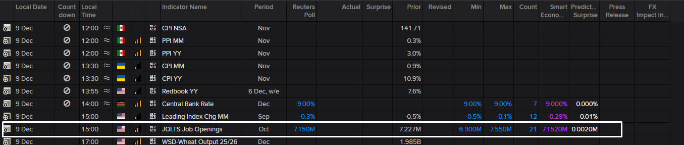 With the US government shutdown in the rearview mirror, and the data fog beginning to lift, the other risk event I will be watching today is the US October JOLTS Job Openings data at 3:00 pm GMT. As shown by the LSEG calendar below, the median expectation is 7.15M (down from 7.23M in September). The estimate range is between a high of 7.55M and a low of 6.90M.